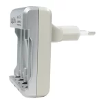 Charge 2pcs or 4pcs AA/AAA, or a 9V Ni-MH/Ni-Cd rechargeable battery, Input: 100-240V AC, 50/60 Hz, 80 mA max, Output: 2.4V DC 400 mA, 200 mA x2/x4 (AA), 100 mA x2/x4 (AAA), 30 mA x1 (9V), Charging time: Approx. 16 hours (AA), 12 hours (AAA), 9 hours (9V), Three LEDs showing the charging status of the batteries in red color, With over charging protection and constant current/ voltage keeping the battery a longer life cycle