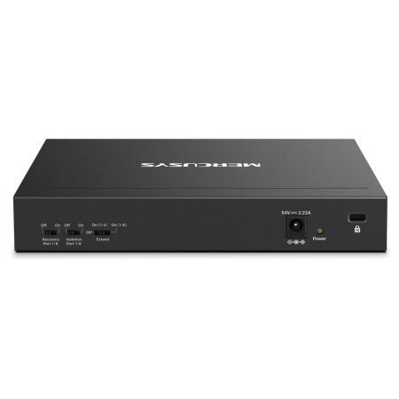 8× 10/100 Mbps PoE+ Ports + 2× Gigabit non-PoE Ports, With 8 PoE+ ports, transfers data and power on one single cable, IEEE 802.3x Flow Control, Support PoE Power up to 30 W for each PoE port and 115 W for all PoE ports, 2× Uplink Ports, External Power Adapter (Output: 54V/2.2A), 10/100 Mbps at Half Duplex, 20/200 Mbps at Full Duplex, Jumbo Frame : 2 KB, Switching Capacity : 5.6 Gbps, MAC Address Table : 2K